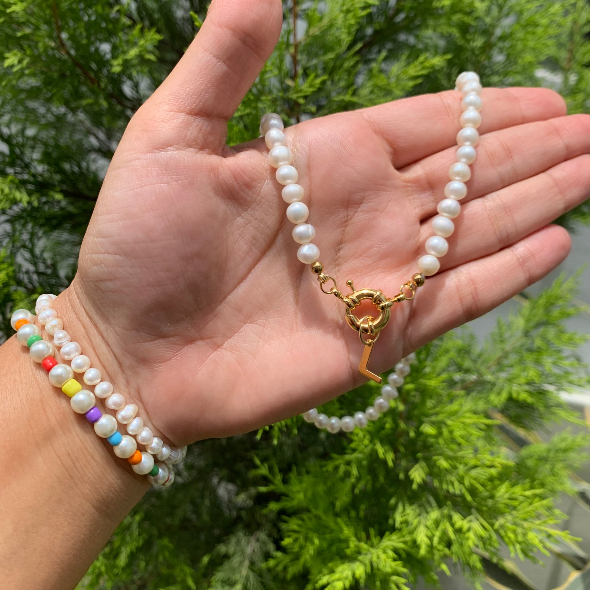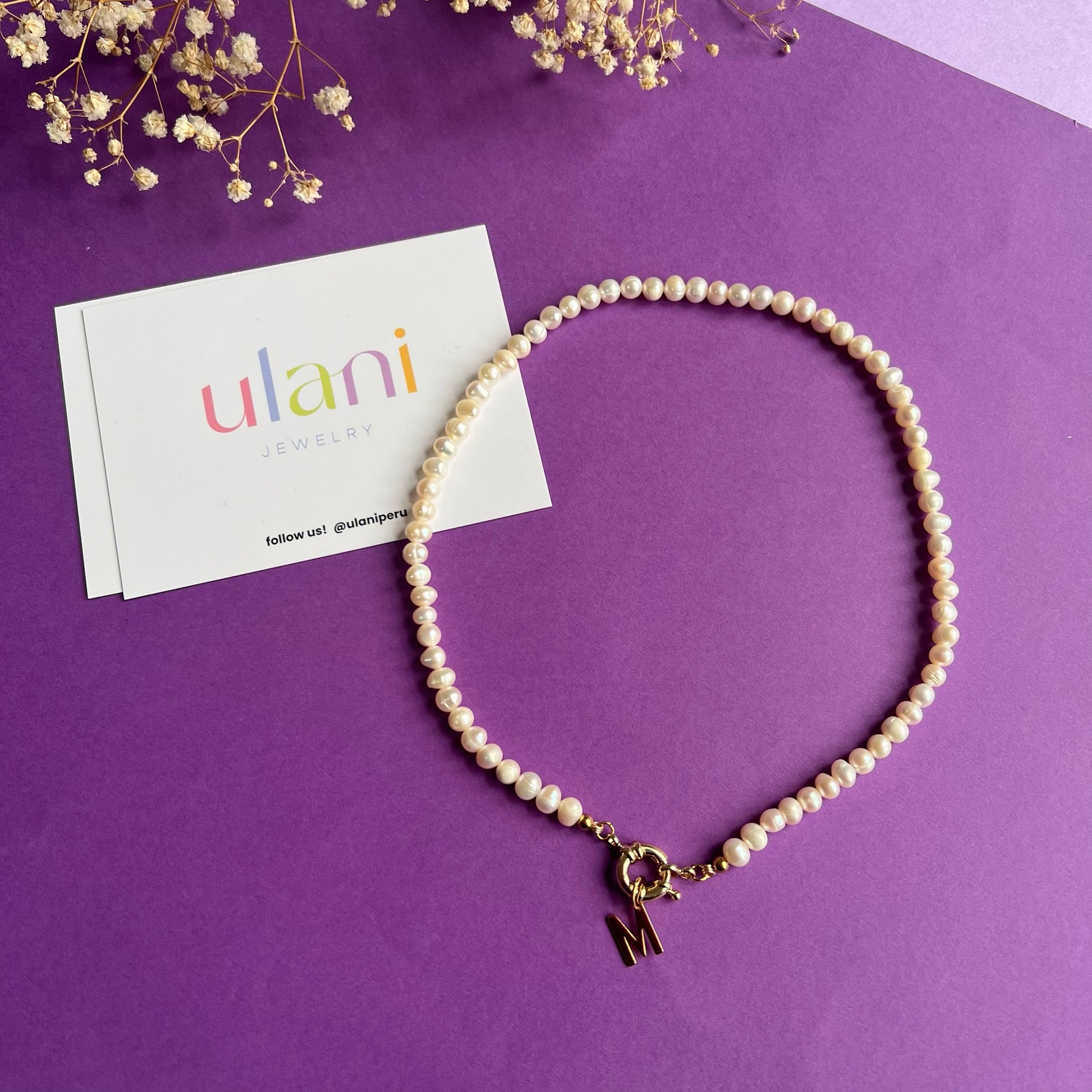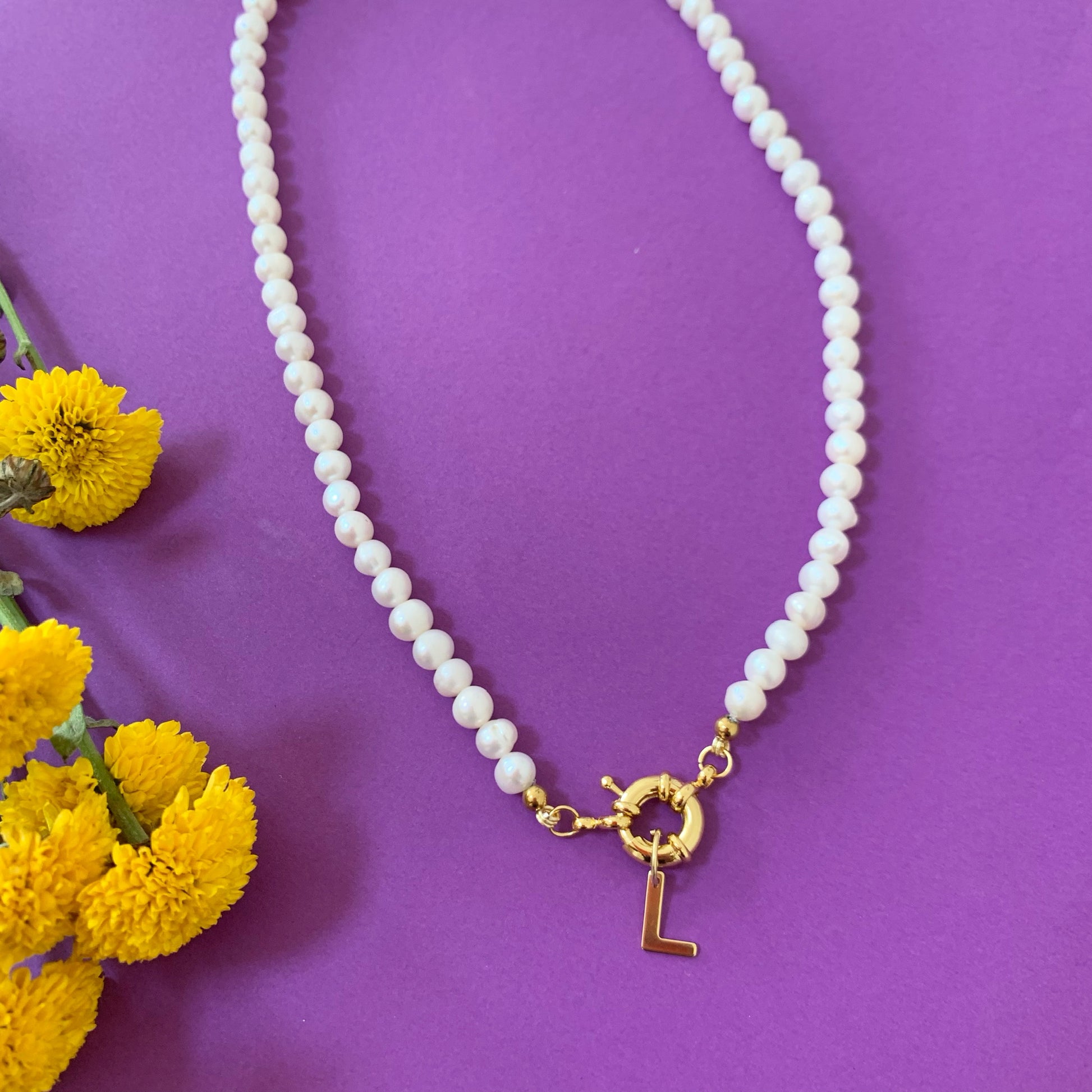 Collar de perlas del rio con broche laminado en oro y dije de inicial colgante