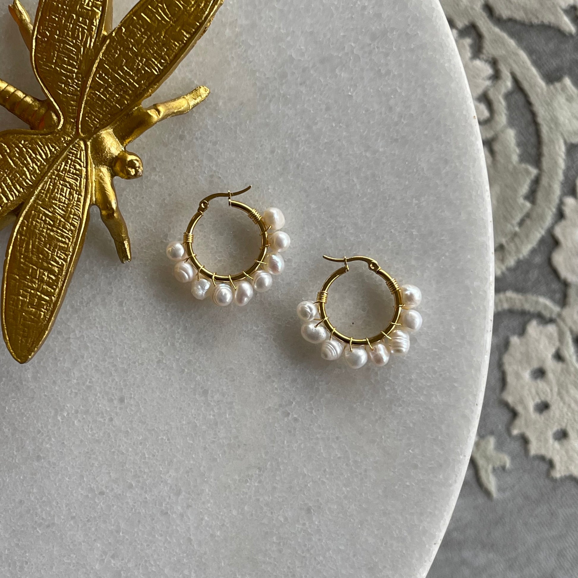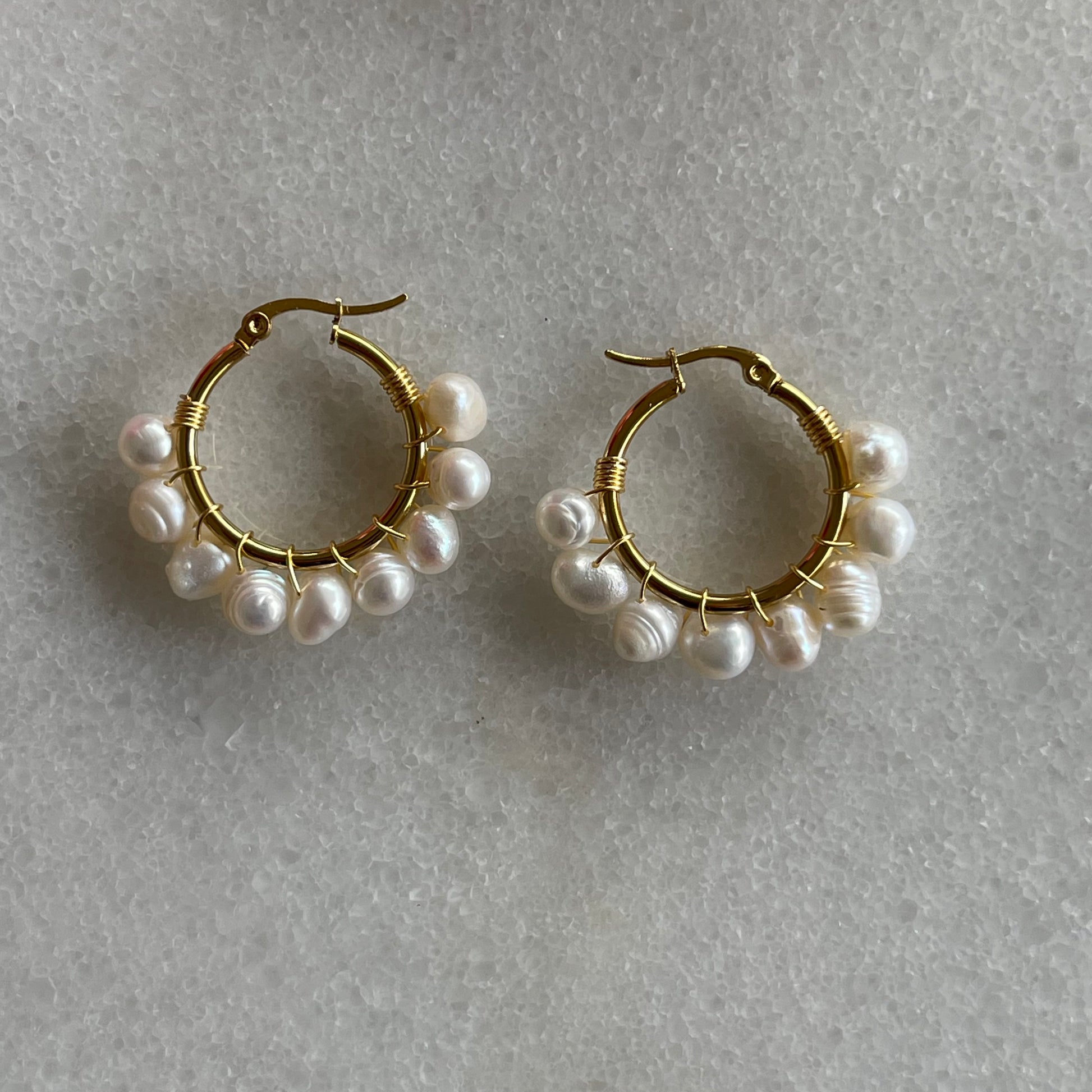 Argollas de acero inoxidable tejidas en la parte de abajo con perlas del rio tamaño 2 cm