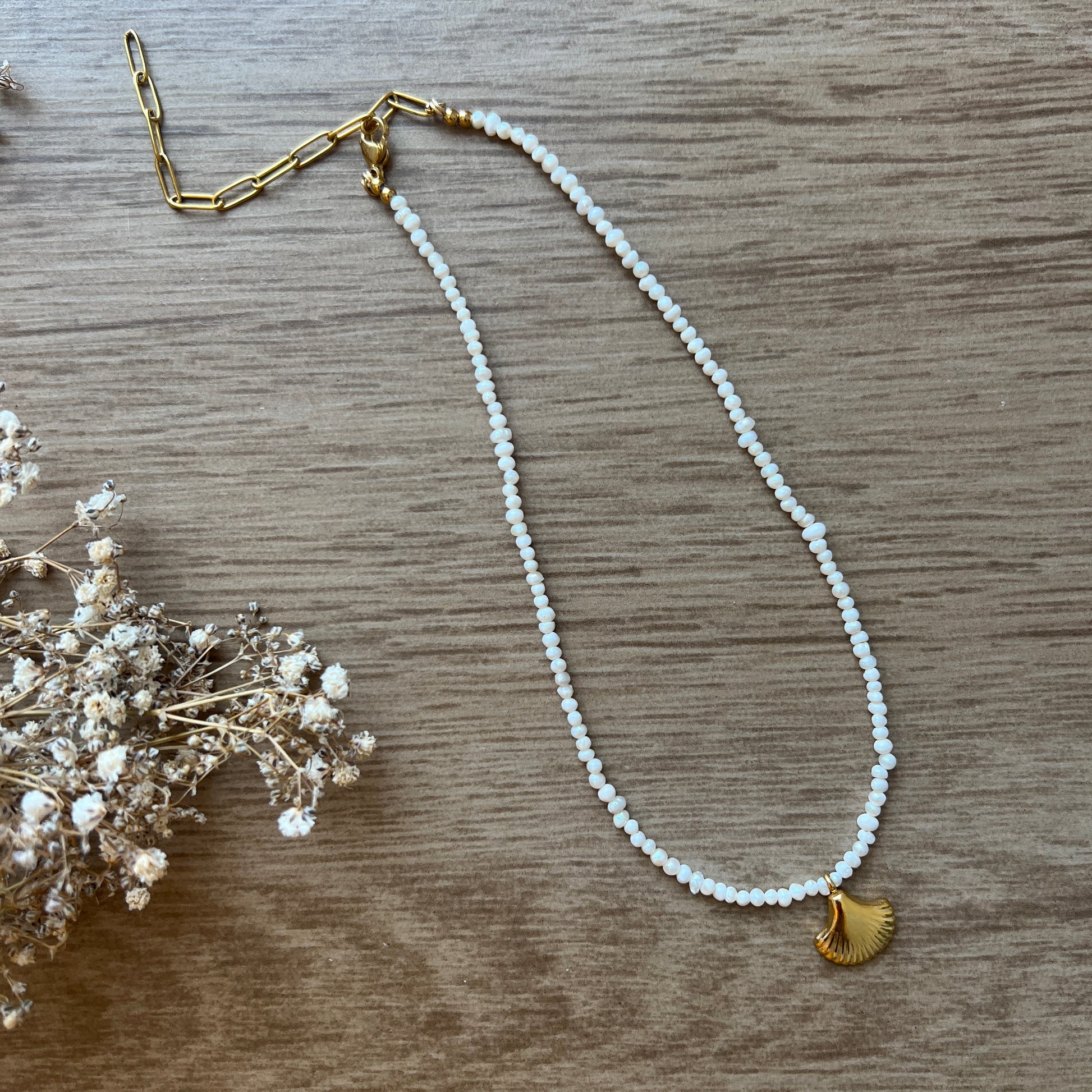 Collar de perlas del río naturales tipo arroz (pequeñas) con dije de conchita bañado en oro